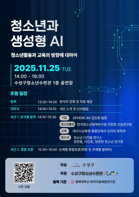 û¼Ò³â°ú »ý¼ºÇü AI Æ÷·³À» °³ÃÖÇÏ´Ï ¸¹Àº °ü½É°ú Âü¿© ºÎʵ右´Ï´Ù. ÁÖÁ¦¿¡ °ü½É ÀÖ´Â Áö¿ª¹Î ´©±¸³ª Âü¿© °¡´ÉÇÏ´Ï ÇØ´ç QRÄڵ峪 https://forms.gle/kx1AqzV9yjqKoZwt5 ¸µÅ©·Î »çÀü ½Åû ºÎʵ右´Ï´Ù. °¨»çÇÕ´Ï´Ù. ¹®ÀÇ 053)761-9400(³»¼± 3¹ø û¼Ò³âȰµ¿ÆÀ) īī¿ÀÅå °ø½Ää³Î Ä«Åå ¹®ÀÇ °¡´É