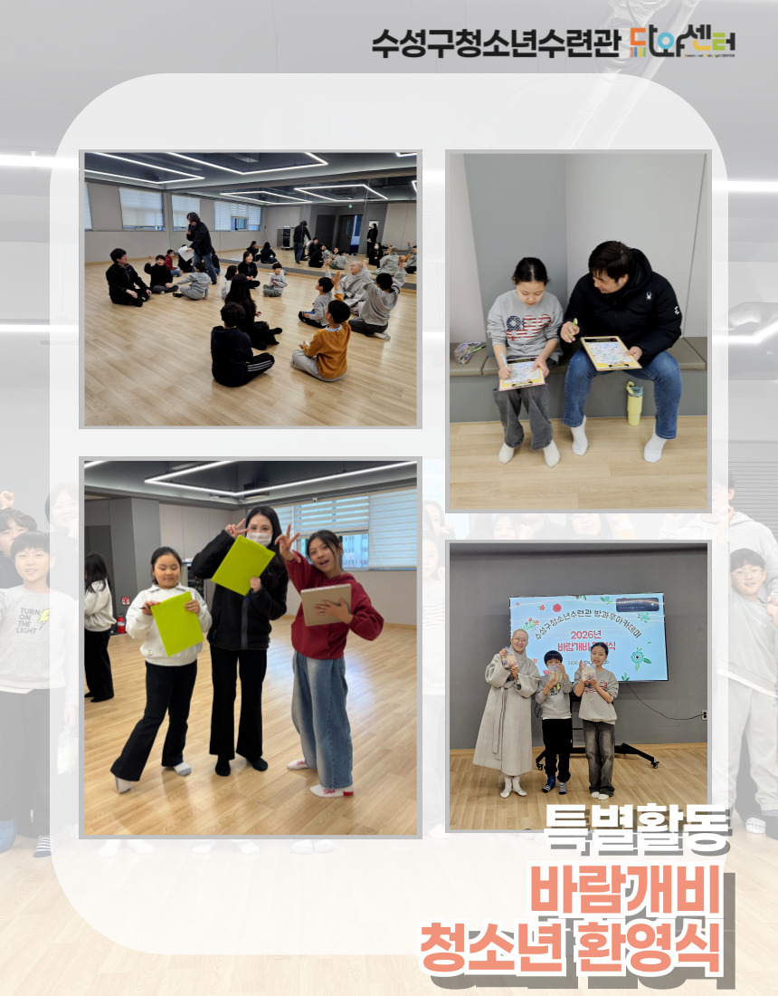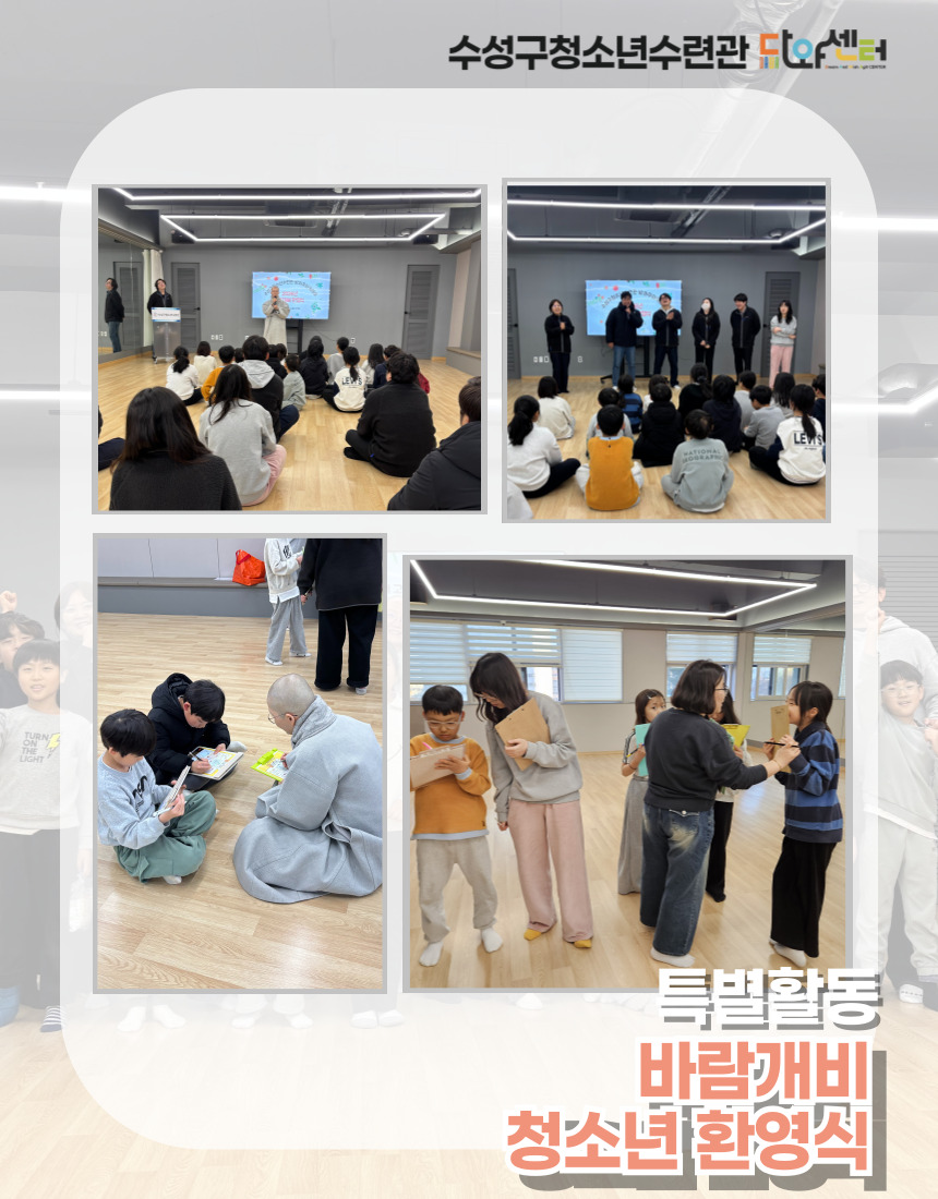 ¾È³çÇϼ¼¿ä! ¼ö¼º±¸Ã»¼Ò³â¼ö·Ã°ü ¹æ°úÈľÆÄ«µ¥¹Ì ¹Ù¶÷°³ºñ ÀÔ´Ï´Ù. 3¿ù 13ÀÏ(±Ý) ¹Ù¶÷°³ºñ û¼Ò³âµéÀÇ »õ·Î¿î ½ÃÀÛÀ» ¸Â¾Æ ¼ö·Ã°ü ¼±»ý´Ôµé°ú ÇÔ²² û¼Ò³â ȯ¿µ½ÄÀ» ÁøÇàÇÏ¿´½À´Ï´Ù.