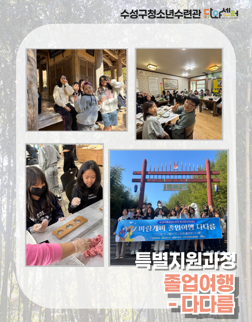 ¾È³çÇϼ¼¿ä! ¼ö¼º±¸Ã»¼Ò³â¼ö·Ã°ü ¹æ°úÈľÆÄ«µ¥¹Ì ¹Ù¶÷°³ºñ ÀÔ´Ï´Ù. 11¿ù 14ÀÏ(±Ý) ¹Ù¶÷°³ºñ û¼Ò³âµéÀÌ Á¹¾÷¿©ÇàÀ¸·Î ´ã¾ç ¹®ÈüÇèÀ» ´Ù³à¿Ô½À´Ï´Ù.