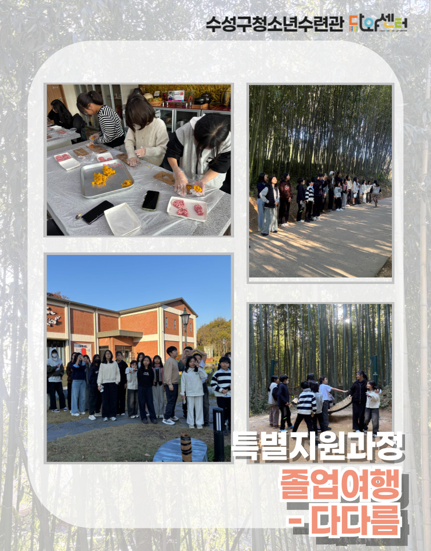 ¾È³çÇϼ¼¿ä! ¼ö¼º±¸Ã»¼Ò³â¼ö·Ã°ü ¹æ°úÈľÆÄ«µ¥¹Ì ¹Ù¶÷°³ºñ ÀÔ´Ï´Ù. 11¿ù 14ÀÏ(±Ý) ¹Ù¶÷°³ºñ û¼Ò³âµéÀÌ Á¹¾÷¿©ÇàÀ¸·Î ´ã¾ç ¹®ÈüÇèÀ» ´Ù³à¿Ô½À´Ï´Ù.