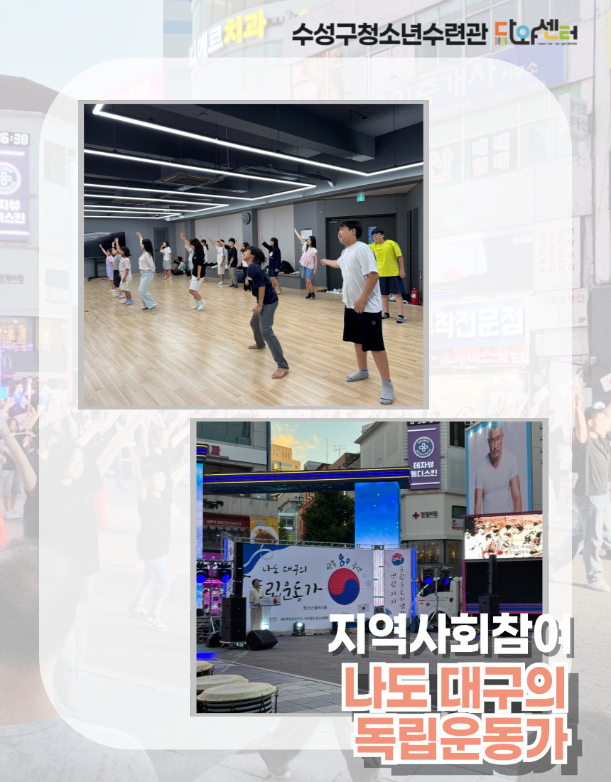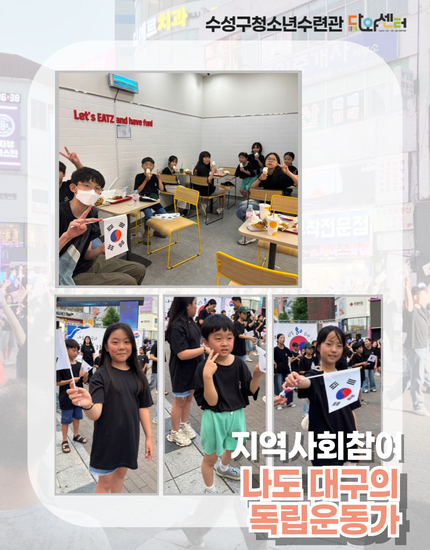 ¾È³çÇϼ¼¿ä! ¼ö¼º±¸Ã»¼Ò³â¼ö·Ã°ü ¹æ°úÈľÆÄ«µ¥¹Ì ¹Ù¶÷°³ºñ ÀÔ´Ï´Ù. 8¿ù 14ÀÏ ³ªµµ ´ë±¸ÀÇ µ¶¸³¿îµ¿°¡ - ±¤º¹ 80Áֳ⠱â³ä û¼Ò³â Ç÷¡½Ã¸÷ ÇÁ·Î±×·¥À» ÁøÇàÇÏ¿´½À´Ï´Ù. ¿¬½À °úÁ¤¿¡¼´Â ¹æ¼Û´í½º ¼ö¾÷ ½Ã°£°ú ½Ç¹«ÀÚ ¼ö¾÷ ½Ã°£À» Ȱ¿ëÇÏ¿© ¾ÆÀ̵éÀÌ Á÷Á¢ ¾È¹«¸¦ ¹è¿ì°í, µ¿ÀÛÀ» ¸ÂÃß´Â °úÁ¤ ¼Ó¿¡¼ Ä£±¸µé°ú Çù·ÂÇÏ°í ¼·Î¸¦ ¹è·ÁÇϴ ŵµ¸¦ ÀÍÇû½À´Ï´Ù.
